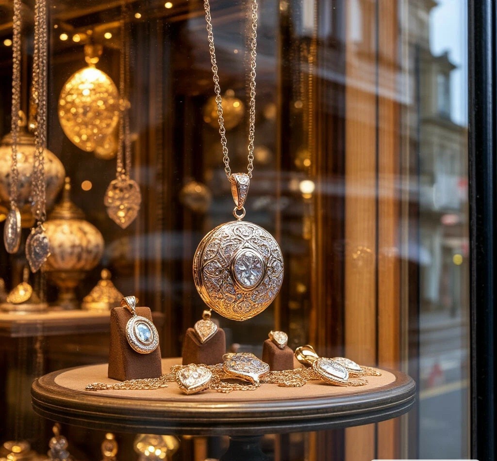 Витрина из стекла с тонкими резными элементами привлекла её внимание. Саша остановилась — её взгляд зацепился за старинный медальон, украшенный загадочными узорами. Она почувствовала, как сердце забилось быстрее. Прикоснувшись к нему, она ощутила странное покалывание.
