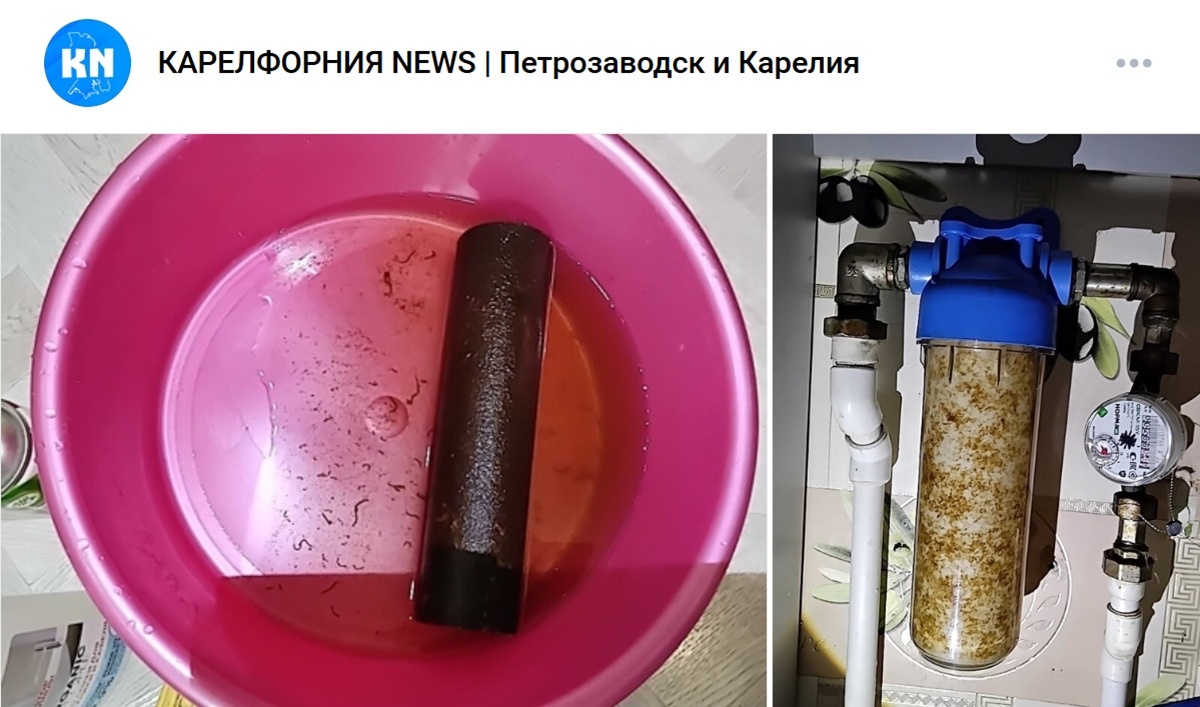 На качество воды жалуются во многих районах Карелии. Люди ставят фильтры в квартирах и домах, но они моментально чернеют или становятся коричневатыми, как только в них попадает вода из труб. Находят даже и живность. Люди возмущены тем, что из кранов для питьевой воды течет будто канализация.