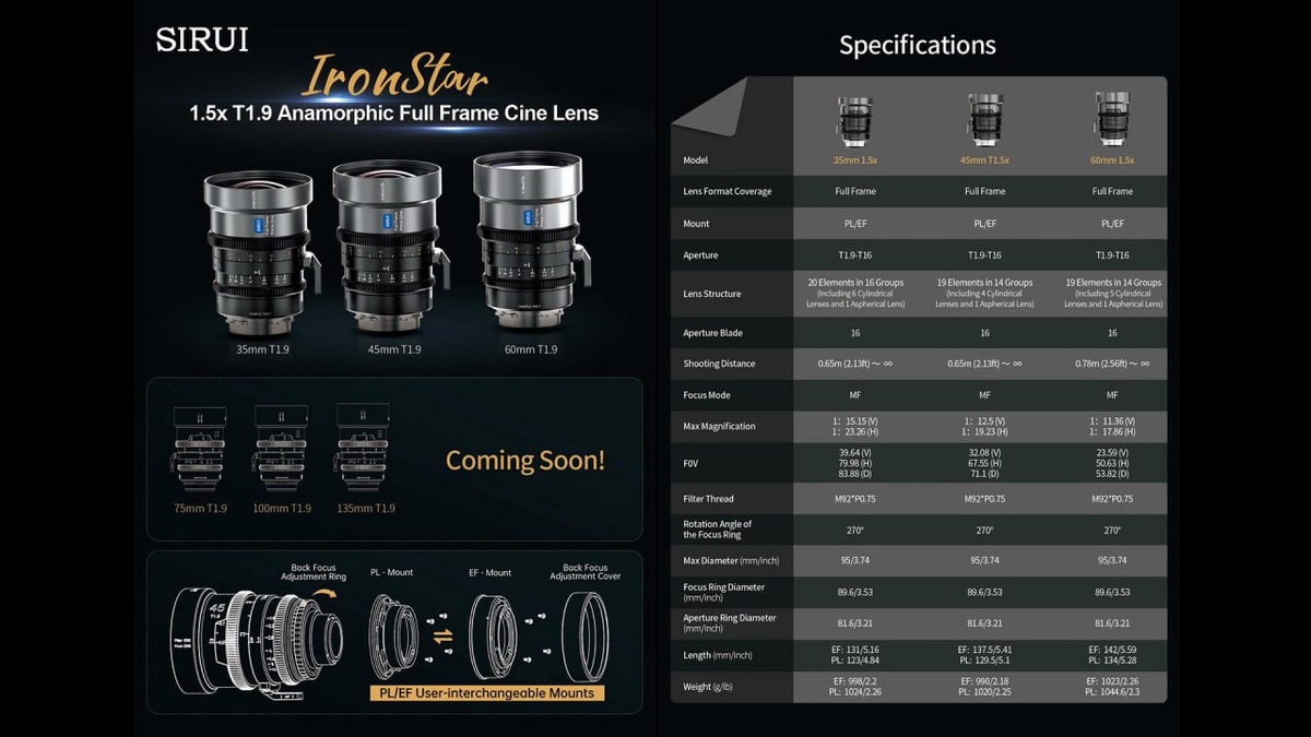 А Sirui идут по проторенной дорожке. Серия IronStar - полнокадровые анаморфоты 1.5х. Первыми, в июле, появляются фокусные расстояния 35мм, 45мм и 60мм, все T1.9. Далее в планах еще 75мм, 100мм и 135мм с той же светосилой. Два цвета бликов, голубые и серебряные. Байонеты PL или EF. Традиционно, для Sirui, продажи начнутся с краудфандинга, стоимость предзаказа будет $1199 за один объектив.