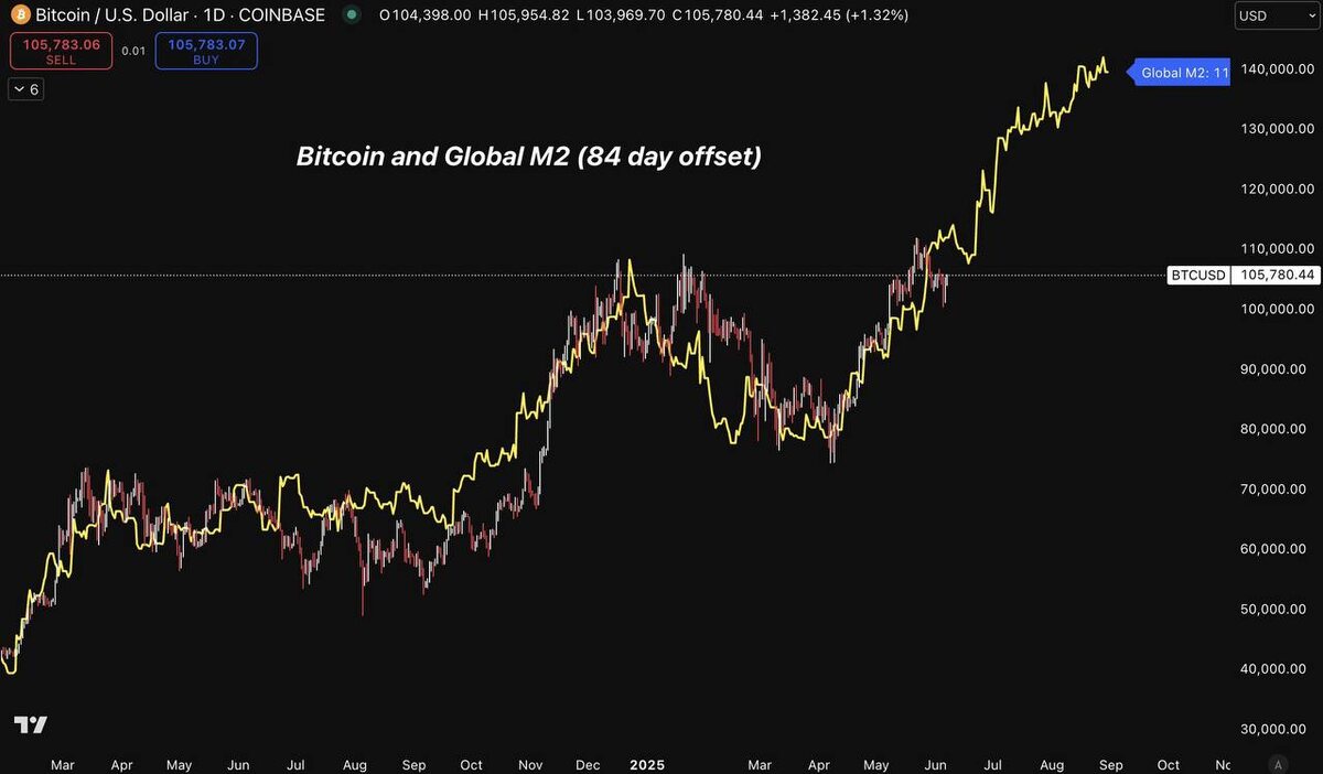 5. С начала запуска ETF и цепочек опционов в 2020 биткоин ходит в унисон с глобальной M2. Сейчас эта кривая указывает на $130,000+ к июлю. Сроки могут сдвигаться, но направление — очевидно.