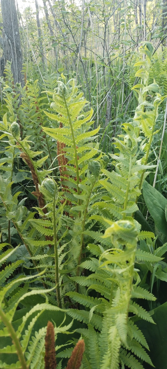 Мы приехали на полянку, где должен был произрастать вожделенный папоротник. Ходим, ищем. А место такое интересное, пригорок и очень крутой спуск к реке. На пригорке сухо и ростки папоротника какие- то тоненькие, субтильные... Я даже засомневалась, то ли мы рвём. Да нет, вроде то... Вон рядом вполне себе орляк, упитанный...