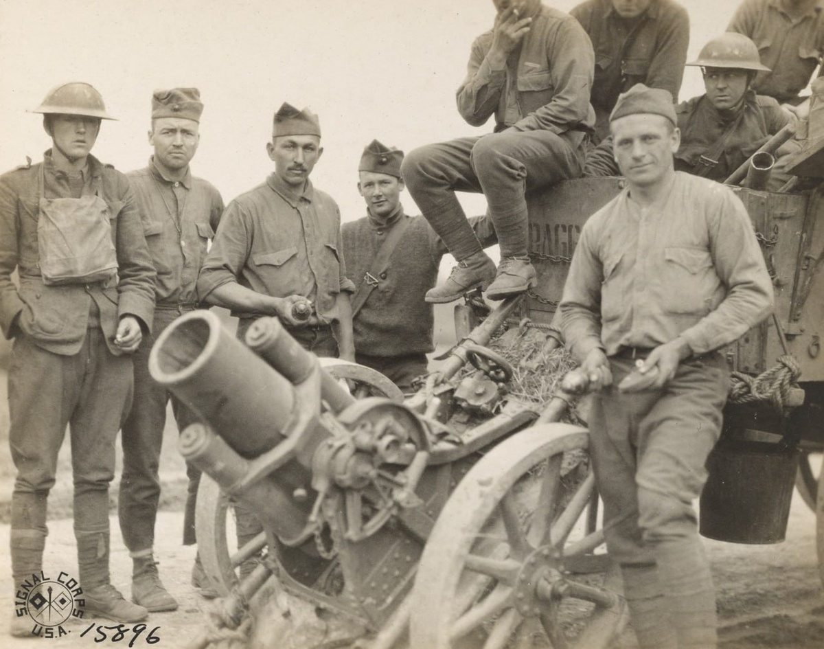 Американские солдаты из 2-го батальона 5-го полка морской пехоты позируют с трофейным немецким траншейным минометом, битва при Белло Вуд, 22 июня 1918 года.