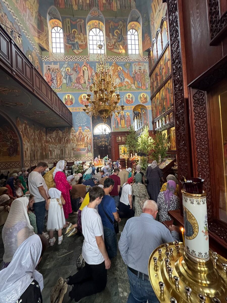 Троицкая вечерня коленопреклонения В сам день праздника, после Литургии, по обычаю, неотрывно от нее, совершается уже другая вечерня, единственная в богослужебном году, когда читаются обращенные к Святой Троице молитвы, а мы все слушаем их коленопреклонно. Это тоже «сбывающееся чаяние» — коленопреклонения и земные поклоны были запрещены Уставом с самой Пасхи. Фото: Успенский собор г. Иваново Теперь мы слушаем эти невероятной силы, глубины, дерзновения к Богу молитвы, склонясь перед их мощью — невозможно их «просто» слушать, стоя или тем более сидя, они как гром с Неба. Да, невозможно и ухватить ухом и умом всё их содержание, войти в это дерзновение к Богу, — но они пронизывают нас, входят в нас. Протоиерей Сергий Правдолюбов (1950–2024), кажется вслед за старцем Иоанном (Крестьянкиным), говорил, что после этих молитв лица у всех людей преображаются и «каждая простая бабка смотрит как Василий Великий». Потому что Дух Святой реально живет в Церкви, и в этот день, в этом богослужении ощу