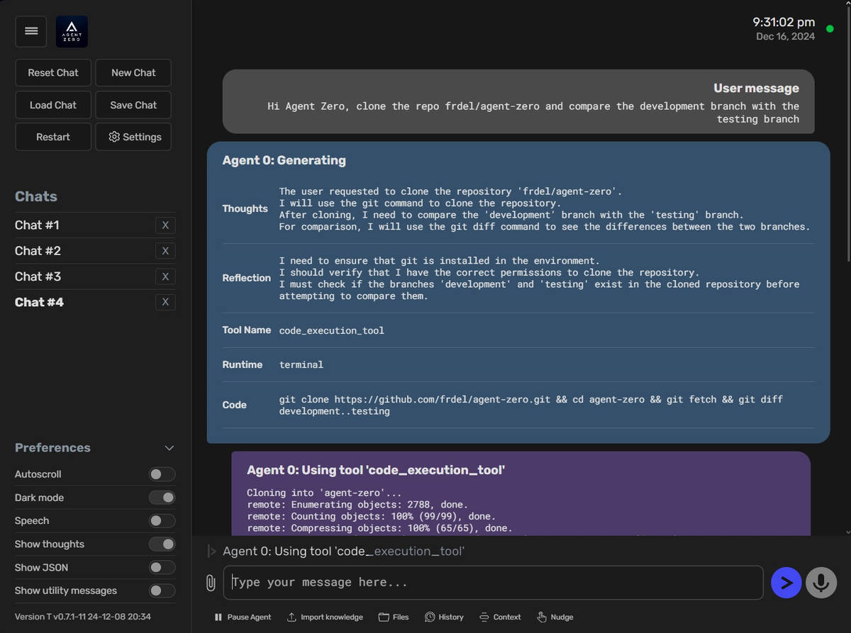 Agent Zero - это динамическая и органическая агентная AI-платформа, разработанная для того, чтобы расти и обучаться вместе с пользователем. Она функционирует как универсальный персональный помощник, использующий компьютер в качестве инструмента для выполнения задач путем сбора информации, выполнения команд и кода, а также сотрудничества с другими экземплярами агентов. Agent Zero представляет собой гибкое и расширяемое решение, поведение которого определяется системным промптом, доступным для модификации пользователем. * Использование ОС как инструмента: Агент может взаимодействовать с операционной системой для выполнения задач. * Создание и использование собственных инструментов: Способность агента создавать и применять собственные инструменты для решения проблем. * Постоянная память: Обладает функцией постоянной памяти для запоминания решений и инструкций, что обеспечивает непрерывное обучение. * Многоагентное сотрудничество: Агенты могут создавать подчиненных агентов для решения подз
