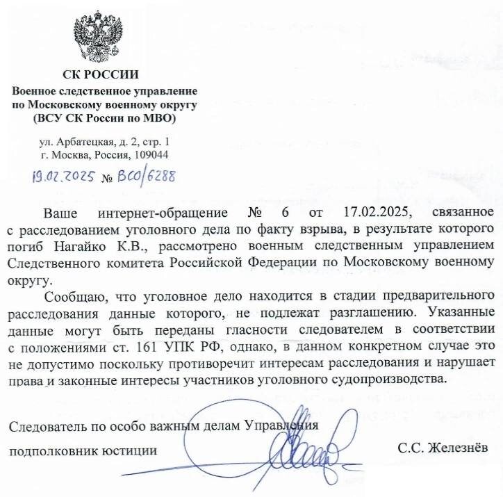 В письме содержится утверждение, что по факту взрыва, в результате которого погиб Константин Нагайко, возбуждено уголовного дело, однако данные расследования не подлежат разглашению, поскольку это "...противоречит интересам следствия и нарушает права и законные интересы участников уголовного судопроизводства".
