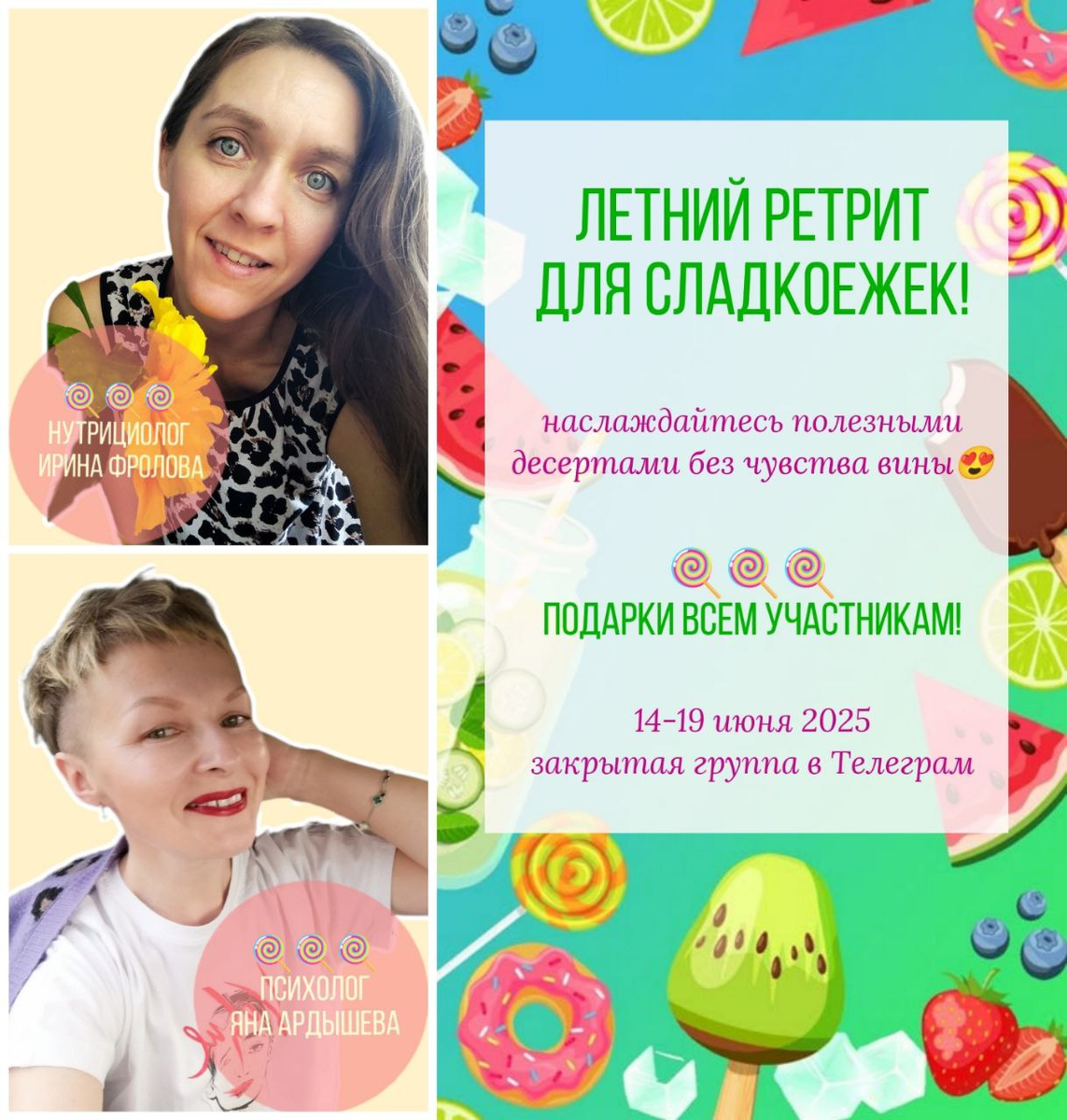 ❓Вы любите вкусняшки, но иногда чувствуете, что они управляют вами? ❓А хотите наслаждаться ими без чувства вины и вреда для здоровья? 🍰🍭 Привет, сладкоежки! 🍭 Лето — время наслаждений 🍭 и сладкое занимает в этом списке особое место! Приглашаю вас на марафон «Летний ретрит для сладкоежек» — 6 дней, которые помогут найти баланс между удовольствием и заботой о себе! На марафоне вы узнаете, как сладкое и полезное могут сочетаться, сохраняя легкость и энергию. Мы дадим только пользу без воды и предисловий. И вы сможете почувствовать результаты сразу, с первого дня! Программа марафона, подарки и все подробности 👉🏻 ЗДЕСЬ