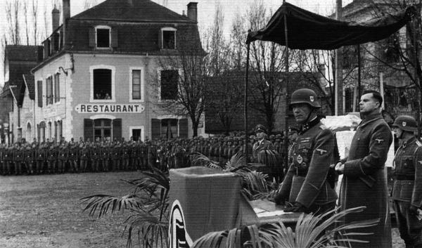 Присяга 7-го галицкого добровольческого полка СС во Франции. Там они защищали Украину, воюя против антигитлеровской коалиции в Нормандии. За трибуной командир полка обер-штурмбанфюрер СС Генрих Хубер. За его спиной полковой капеллан о. Данило Ковалюк.