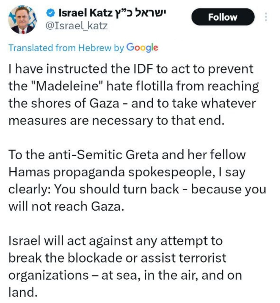 В ответ на пост Netanyahu's defense chief says Greta’s 'HATE flotilla' WILL be stopped Vows to take 'whatever measures' needed Tells 'anti-Semitic' Thunberg to turn back