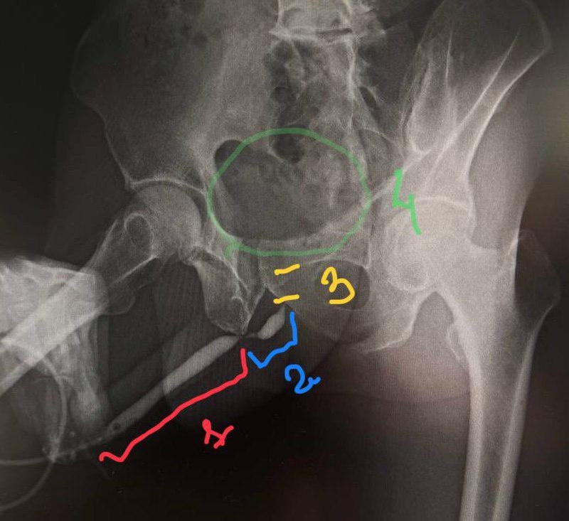 В ответ на пост 1 - пенильный отдел, 2 - бульбозный отдел (где и есть основная проблема), 3 - предполагаемая область нахождения мембранозного отдела (контраст не попал - пациент мог зажаться во время ретроградной уретрографии), 4 - мочевой пузырь (должен быть там). Правильный ответ - дистальный бульбозный отдел уретры.