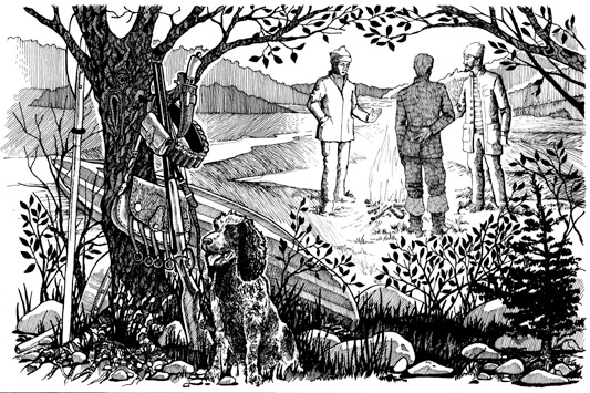Вскипятив для оперативности чай на примусе «Шмель», мы начали сборы в водную экспедицию по исследованию охотничьей фауны озера. Байдарка стояла носом на выход их бухты, еще на мели, но уже на воде, а мы укладывали в нее весь наш походный скарб, рассовывая вещи по всем свободным полостям, забивая носовой и кормовой отсеки, укладывая пакеты под борта. Потому что на двухместной байдарке предстояло плыть трем охотникам, а также спаниелю Флинту. Я, как командир этого судна, располагался на месте рулевого в корме. Флинт сидел здесь же у меня между колен. Мишино место было впередсмотрящего – в носу. По центру себе посадочное место организовал Толя, непрерывно высказывая сомнения относительно безопасности подобного перемещения по воде. Ружья у каждого смотрели вверх стволами.