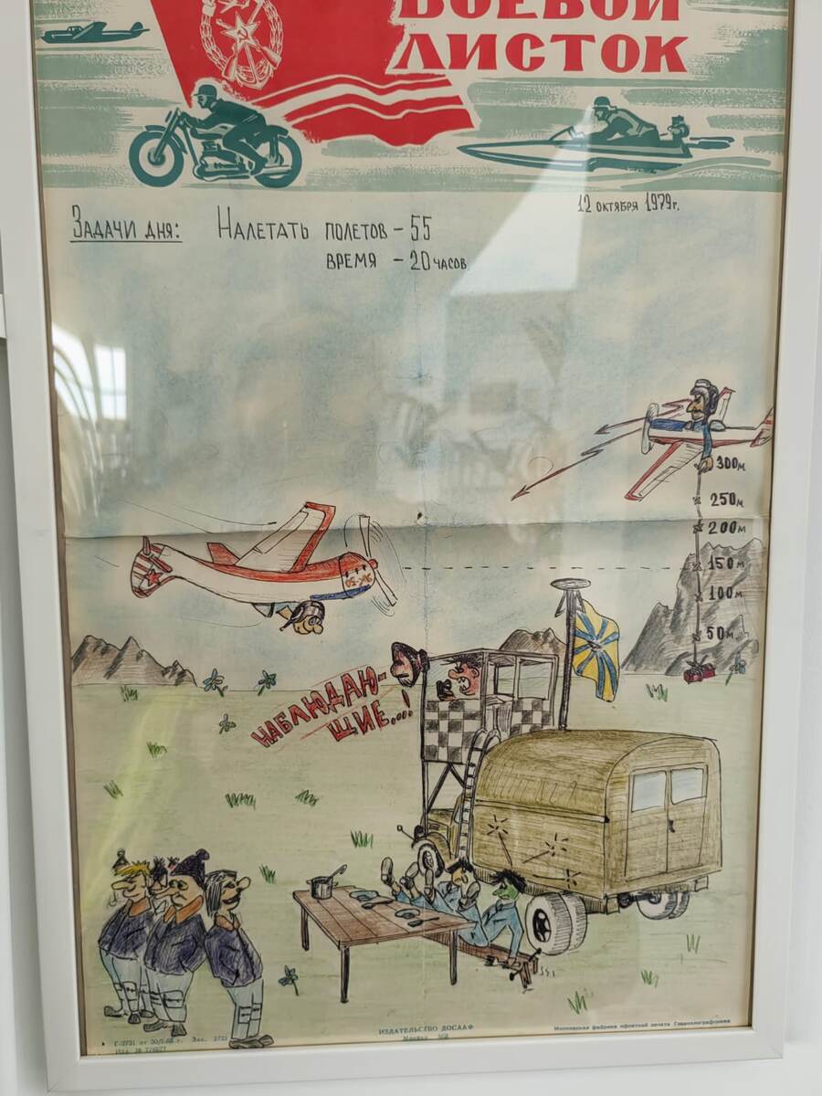 Музейные сотрудники смогли сохранить и оформить данные предметы, среди которых особенно выделялись 47 боевых листков, написанных в период с 1977 по 1988 годы по окончании летных смен на аэродромах, где проводились сборы команды. В то время рисование и написание боевых листков, были практически обязательным требованием руководства, независимо от заслуг и ранга спортсменов. Да и события попавшие в боевые листки чаще всего были незначительными отклонениями в выполнении тренировочных полетов спортсменами тех лет. Так же активно описывался с присущим авиатором юмором быт и обеспечение спортсменов на сборах. Рисунки разных авторов, кто то разворачивался в своем таланте на всю мощь, кто то просто перечислял события или "отмечал" своих коллег, допустивших какие то недочеты. Отмечали дни рождения, самостоятельные вылеты на новых типах пилотажных самолетов того времени. Например на Як-50 в 1982 году, на аэродроме Ессентуки выполнил первый самостоятельный полет будущий многократный чемпион мира по высшему пилотажу на планерах, а в то время молодой спортсмен сборной Георгий Каминский.