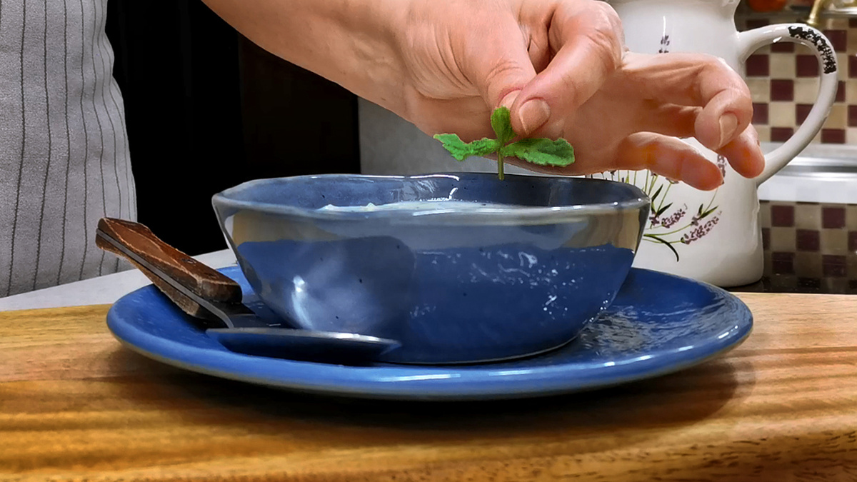 Всё! Солим, перчим по вкусу и перемешиваем. Разливаем по тарелочкам и украшаем листиками мяты. Но это если нужно поразить гостей. А просто так для себя, конечно можно без таких украшательств обойтись. Ведь мята у нас есть уже в самом составе.