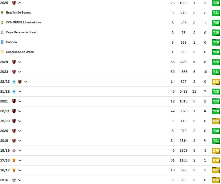 🌟 Стоит ли Жерсон 25 млн евро и 6 млн евро зарплаты? 25 млн евро - несмотря на 28 лет - это более чем справедливая цена для игрока, который играет в сборной Бразилии, пусть эта сборная сейчас радикально слабей тех, которые становились чемпионами мира. На фото средняя оценка Жерсона по турнирам на протяжении карьеры и как мы видим, он максимально стабильный игрок. 🔴Жерсон третий во "Фламенго" по количеству передач за текущий и прошлый сезон 🔴Жерсон делит второе место в команде по количеству ключевых передач в текущем и прошлом сезоне 🔴Жерсон 4-й по количеству прогрессивных передач за текущий и прошлый сезон 🔴Жерсон 4-й по передачам в штрафную и лучший по точности данных передач среди тех кто сделал больше 50 (у него 118) 🔴 Жерсон второй в команде по количеству единоборств в текущем и прошлом сезоне 🔴Жерсон второй игрок в команде по количеству попыток дриблинга за текущий и прошлый сезон, при этом с очень высокой эффективностью этого дриблинга 🔴Жерсон второй в команде по к