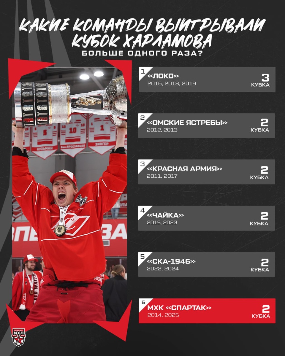 МХК «Спартак» теперь входит в клуб двукратных чемпионов МХЛ 👏 Кто ещё выигрывал Кубок Харламова больше одного раза и как это было? Все подробности на сайте 👇 🔗 mhl.khl.ru/news/20671/1059384/ 🏒 @mhlrus