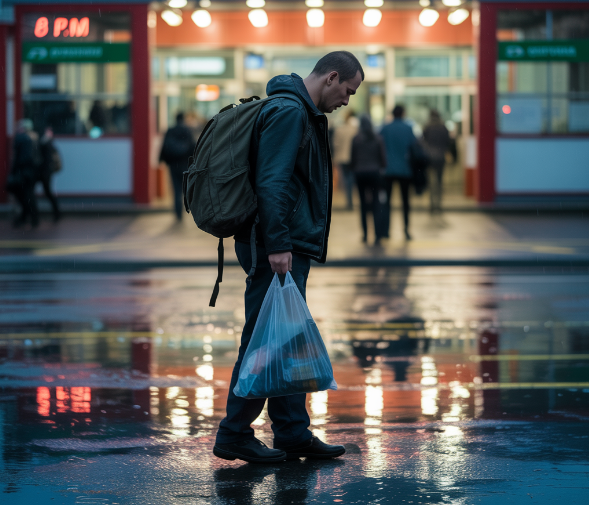 Через пару минут к машине подходит мужчина лет тридцати пяти. Рюкзак за плечами, в руке пластиковый пакет с какими-то вещами. Но главное — лицо. Представьте себе человека, который только что получил какую-то очень неприятную новость.