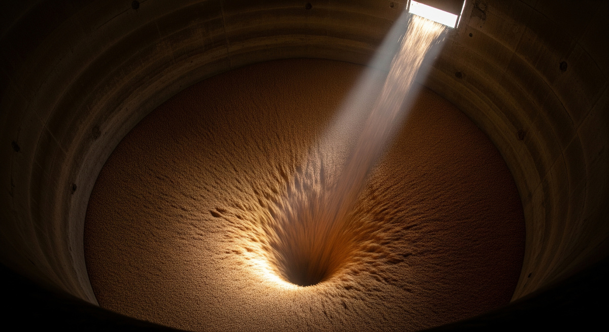 Роковой день настал через месяц. Мне нужно было взять образцы зерна для анализа. Поднявшись наверх, я понял, что Семён был прав. Уровень зерна опустился почти на метр. Но поверхность была идеально ровной, гладкой. Словно под ней была не пустота, а твёрдое дно.
