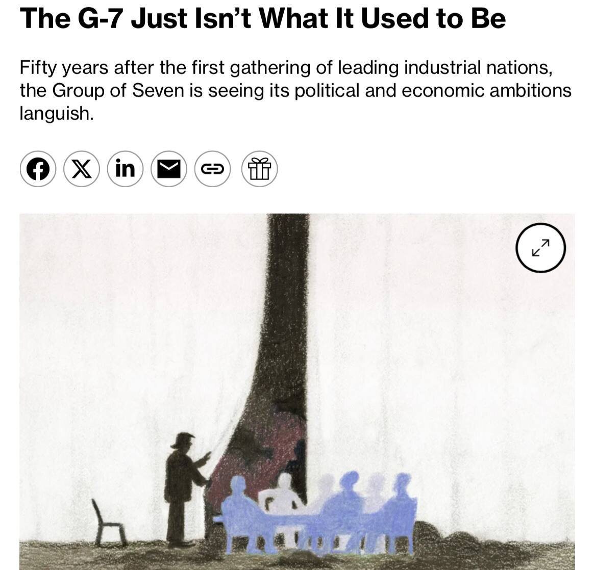 ⚠️ Bloomberg: Дни «Большой семерки» сочтены «Через полвека после первой встречи элиты стран мира дни «Большой семерки» сочтены. Доля государств мира, которые она представляет, сокращается, при этом сокращается и ее влияние», — сказано в публикации. Агентство отмечает, что влияние стран G7 на мировую экономику и население снижается. Сейчас на эти страны приходится менее 30% мирового ВВП и 10% населения. Когда Канада присоединилась к группе в 1976 году, на семь стран приходилось 70% мирового ВВП. Как пишет издание, исключение России из формата G8 положило конец политическим амбициям объединения, а скептическое отношение Трампа подрывает его экономические цели. ✍️ НАСОНОВ 🔴