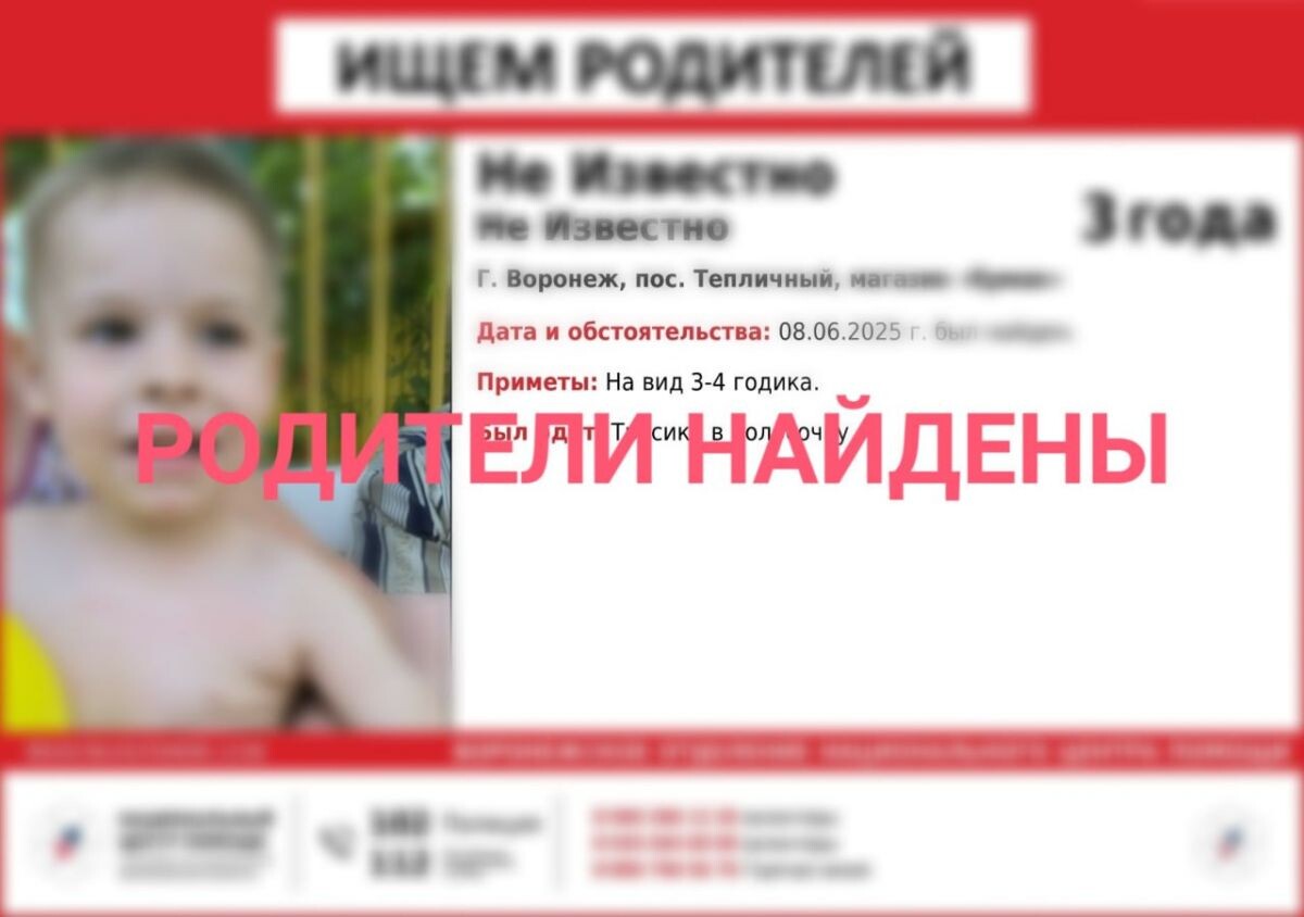 Родители потерявшегося в воронежском микрорайоне Тепличный мальчика нашлись. 3-летнего ребенка уже вернули родителям. Об этом рассказали в пресс-службе регионального отделения национального центра помощи. Напомним, мальчика нашли у магазина "Ермак". Он не назвал своё имя и адрес проживания. На мальчике были лишь полосатые трусы. Ребёнку, предположительно, около 3-4 лет. Волонтеры оперативно распространили ориентировку о поиске родителей мальчика. А во вторник, 3 июня, волонтеры объявили о поисках 69-летней Любови Саватеевой. Пенсионерка покинула свой дом и не вернулась. По информации волонтёров, женщина страдает от потери памяти и не может ориентироваться в пространстве.