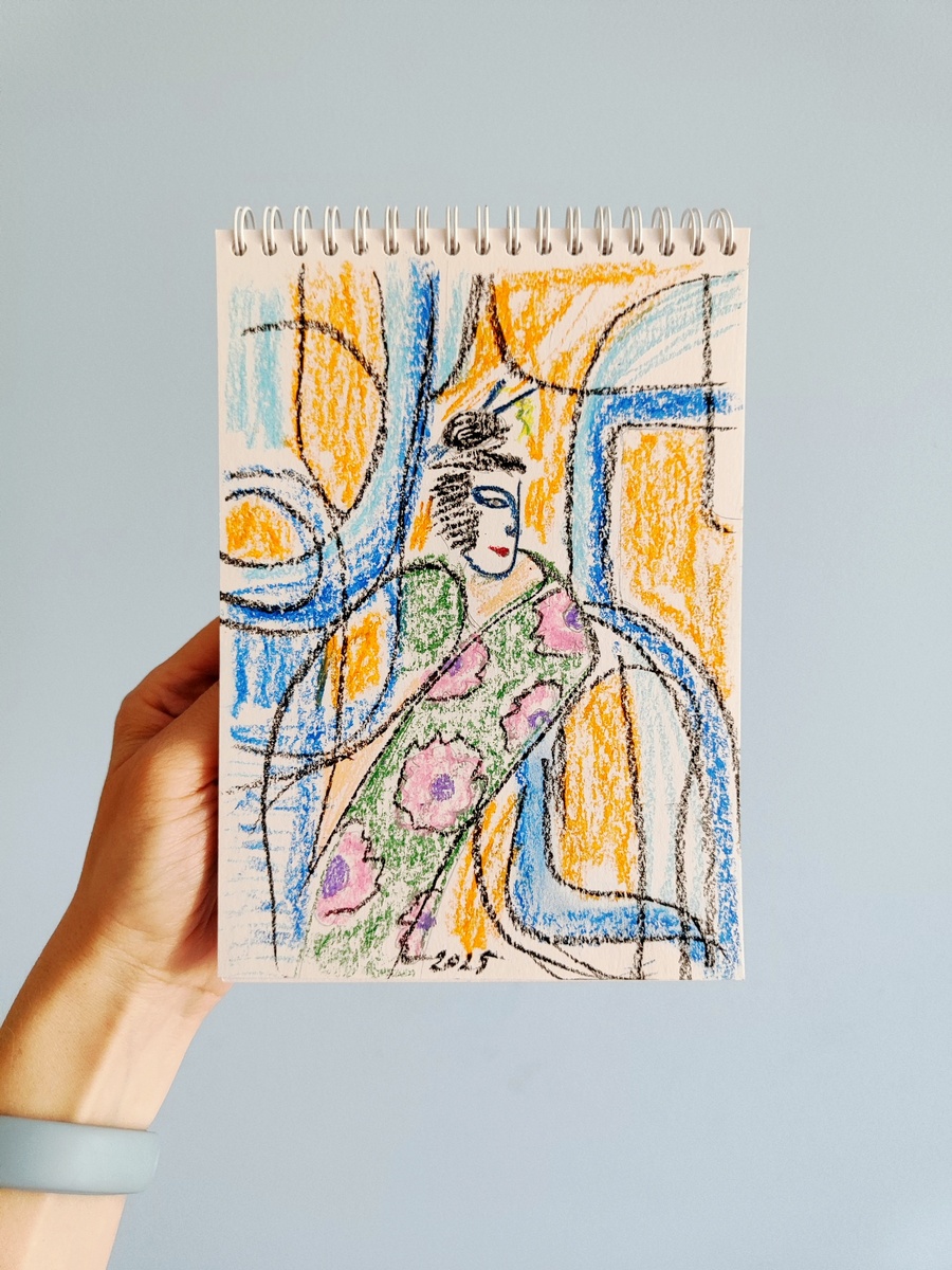 Когда-то давно я учила японский язык, и даже ездила сдавать экзамены в Москву. Сейчас я почти ничего не помню, даже прочитать на катакане не смогу. Но любовь к японскому искусству живёт где-то на подкорке головного мозга)) Эскиз масляной пастелью. Чем не артист кабуки? ⛩🎏