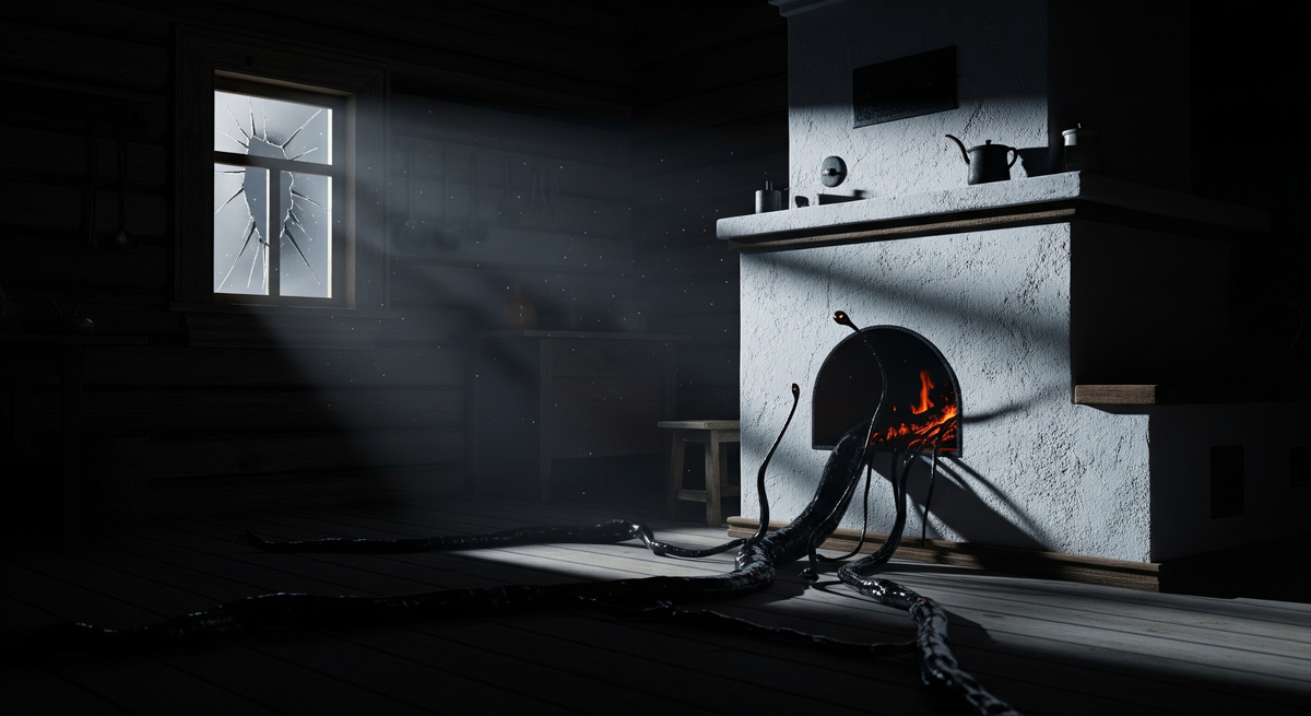 Дым клубился, сгущался, и из него, прямо из стен печи, начало формироваться оно. Дымоход. Уплотняясь от жара, он обрел почти физическую форму. Гигантское, извивающееся тело из спрессованной, лоснящейся сажи, без глаз, без пасти, но живое и полное ненависти. Оно поползло по полу, направляясь к самому слабому — к бабушке.