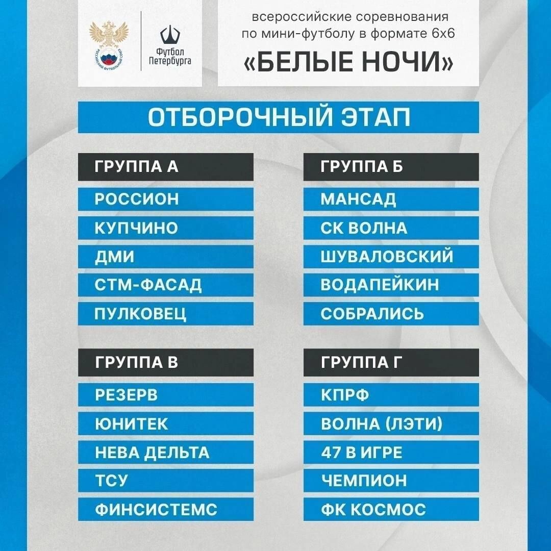 В турнире сыграют 20 любительских команд. Матчи группового этапа пройдут 14 и 21 июня, плей-офф – 28 июня. Все игры примет стадион «Нова Арена», сообщили в Федерации футбола. Победитель отбора представит Петербург на финальном этапе, также в турнире «Белые ночи» примет участие «Эксклюзив» в статусе чемпиона прошлого года. Всероссийские соревнования «Белые ночи» пройдут с 18 по 21 июля на стадионе «Кировец». Ранее в Петербурге прошел турнир по мини-футболу «Кожаный мяч» на Кубок губернатора.