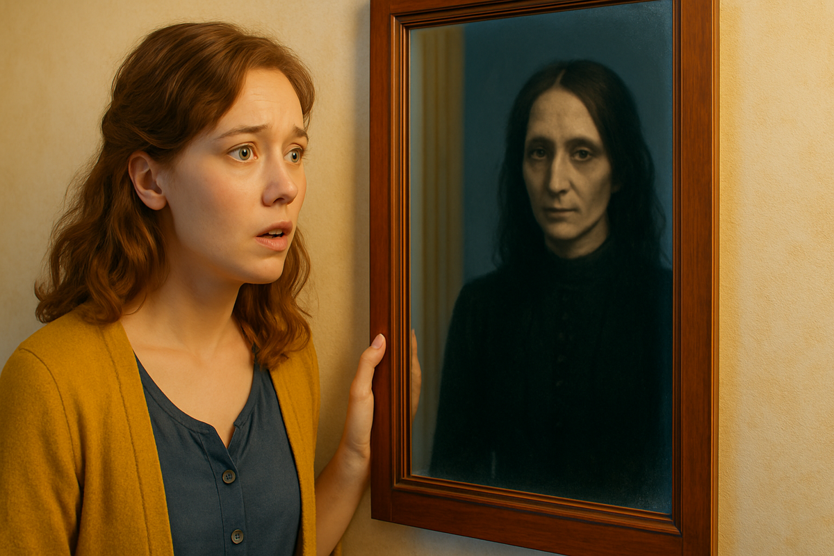 Но в доме оно снова появилось. На том же месте. Только теперь — рама треснута, и в отражении на стене позади — кровавые отпечатки ладоней.