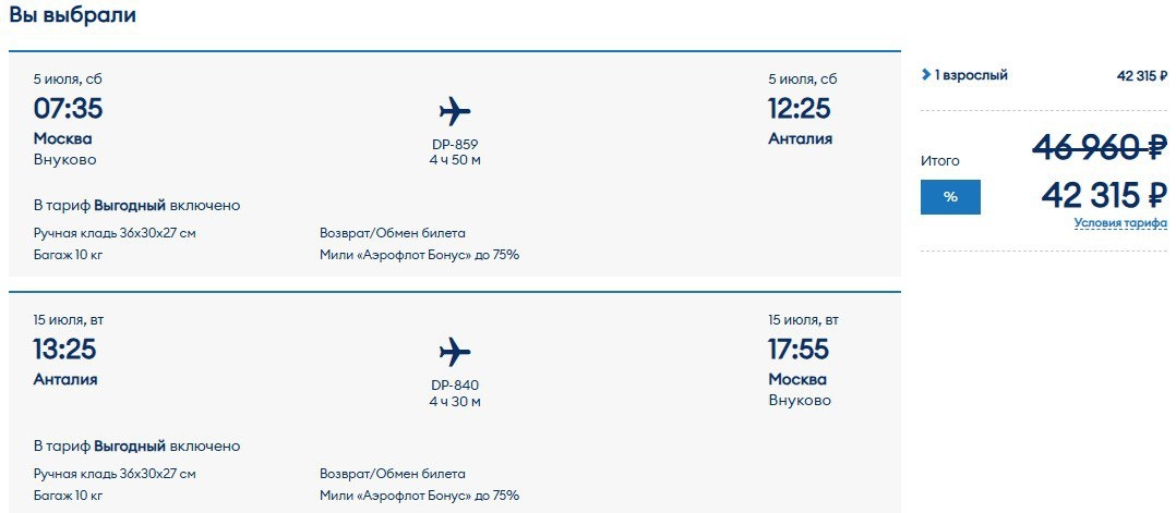 Авиакомпания «Победа» напомнила в своем тг-канале о скором завершении очередной распродажи. Мы проверили цены билетов со скидками на самом популярном летнем туристическом направлении – в Турцию. Слетать лоукостером из Москвы в Анталью с багажом 5 июля, обратно – 15-го предлагается за 42,3 тыс. руб. Чартером AZUR air в те же даты дешевле – 40,7 тыс. руб., перевозка чемодана также включена. Не получится сэкономить и на рейсе «Победы» на турецкий курорт 19 июля с возвращением в столицу через 10 дней. Тарифы мы смотрели в 13:00. Подробнее читайте на ТурДоме. @tourdom