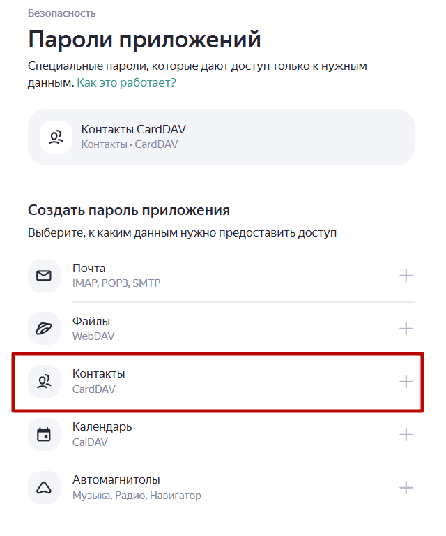 Для предоставления доступа к контактам используется протокол CardDAV. Вы можете синхронизировать контакты в Почте с адресной книгой вашего смартфона. Чтобы это сделать, создайте учетную запись CardDAV и настройте ее на мобильном устройстве: Android Шаг 1. Создайте пароль приложения 2. Выберите тип приложения Контакты и придумайте название пароля, чтобы его было проще найти в списке. Например, укажите название приложения, для которого вы создаете пароль. 3. Нажмите кнопку Создать. Пароль приложения отобразится во всплывающем окне. Важно Пароль можно увидеть только один раз. Если вы ввели его неправильно и закрыли окно, удалите текущий пароль и создайте новый. Шаг 2. Настройте приложение для синхронизации Примечание Ниже описан общий порядок действий. Интерфейс приложений может отличаться. Шаг 3. Добавьте контакты из Почты в контакты телефона iOS Шаг 1. Создайте пароль приложения Шаг 2. Добавьте учетную запись CardDAV Примечание Инструкция подходит для устройств с iOS версии 14. В дру