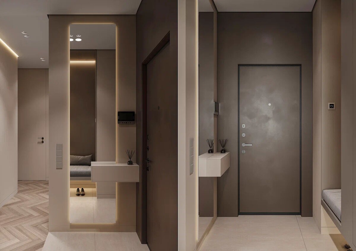 - Встроенная подсветка или настенные светильники, направленные на зеркало, создадут мягкое и рассеянное освещение, сделают коридор более уютным и добавят глубины.