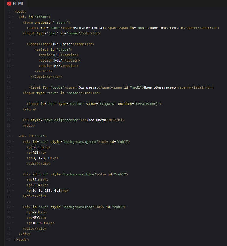 ТЗ - Необходимо создать HTML-страницу, на которой будет расположена форма для создания цветов и ниже три примера уже готовых цветов. В форму должно входить два поля ввода (название цвета и код цвета) и одно поле с выпадающим списком. В создаваемых цветах должна отображаться вся информация, введенная в форму. А также необходимо установить валидацию для формы.