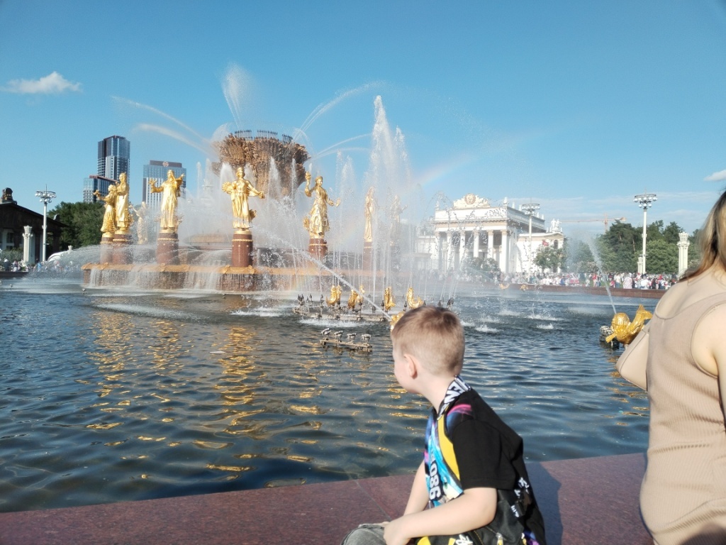 После обеда мы решили немного погулять. Муж обнаружил, что забыл в городе мышку для ноутбука, так что мы направились к метро Алексеевская в М-Видео. Всю дорогу слушали нытье Юрика, что он хочет Спрунки. Уже к тому моменту, как мы дошли до магазина, поняли, что надо разрешить ребенку брать с собой игрушку каждый день. Забрали мы мышку и пошли обратно, погулять по ВДНХ. Думали, что сходим или в Москвариум, или в павильон Роскосмоса. Но, когда мы туда пришли, оказалось, что именно в это воскресенье там проходит закрытие фестиваля "Движение первых". А это толпы народа, много разных мероприятий, сцен, и... ребенок, который хочет куда угодно, в том числе в отель, только не туда, куда хотим мы. Прошли мы досмотр, и Юрик начал баловаться. То убегает, то кривляется. То ли устал, то ли протестовал, что его игрушки остались в отеле, не знаю. Но у нас возникла задача не потерять в толпе ребенка, который еще плохо говорит. Нет, его даже можно понять, но не всегда с первого раза. И это мы уже привык
