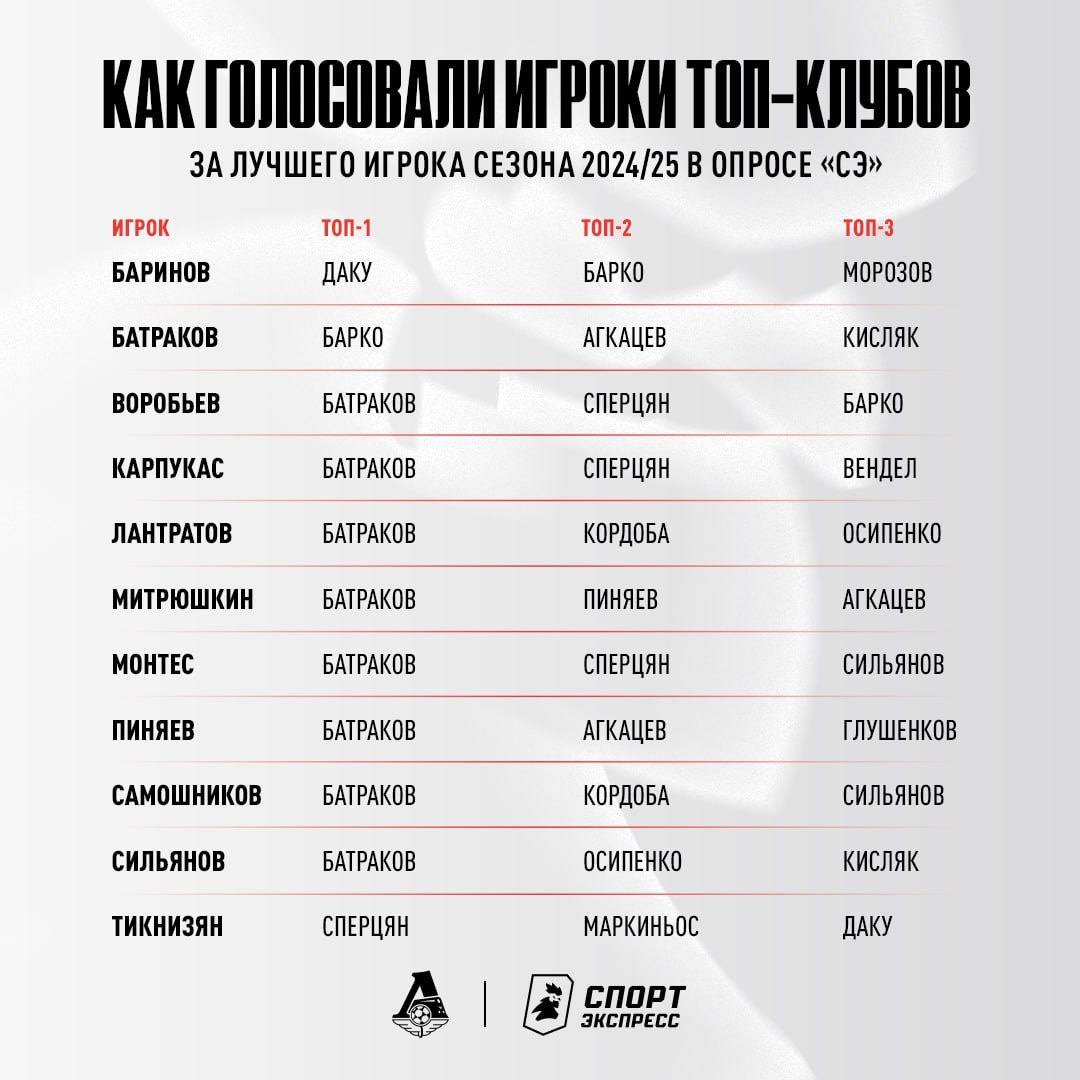 В голосовании СЭ на лучшего игрока РПЛ сезона 24/25 из Локо за Даку проголосовали только Баринов и Тикнизян