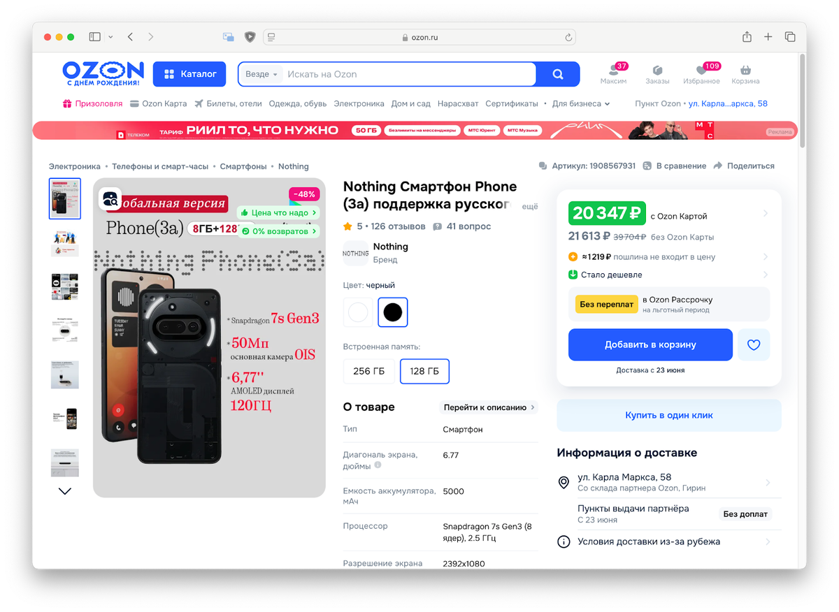 Самый выгодный способ приобрести Nothing Phone (3a) — обратиться к маркетплейсам. Личный опыт показывает, что на AliExpress покупка проходит относительно гладко, несмотря на возможные задержки на таможне. Во время распродаж версия с 8/128 ГБ обойдётся примерно в 25 тысяч рублей, а модель с 12/256 ГБ — в 29 тысяч. Доставка доступна как с местных складов, так и напрямую из Китая, хотя вторая опция может затянуть сроки. На Ozon цена смартфона немного ниже, но и ожидание доставки растягивается сильнее.