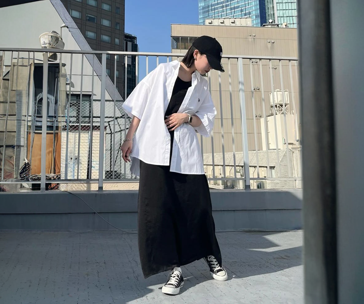 Почему это работает: сочетание базовых чёрных и белых вещей — классика летнего «умного кэжуал». Юбка макси с кедами создаёт неожиданную пропорцию, а рубашка, наброшенная без усилий, придаёт лёгкости.