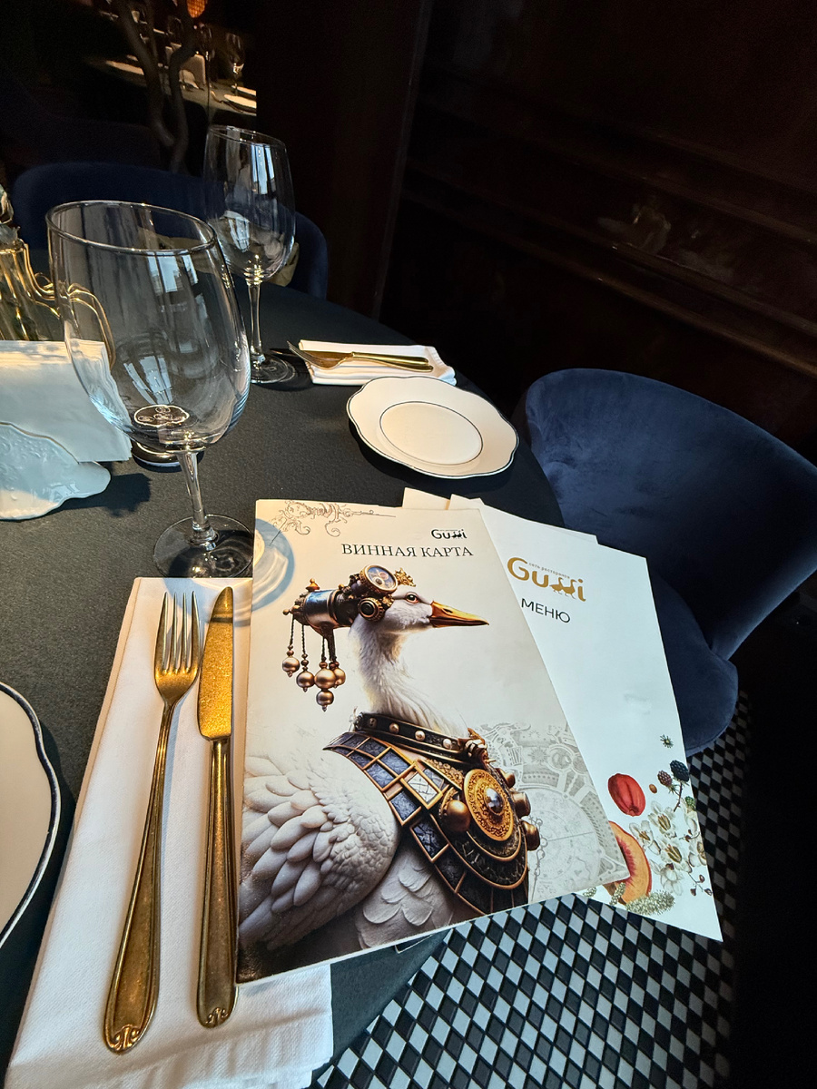 🪿Ресторан Gussi на Никольской. Супер колоритный, необычный, завораживающий интерьер с деталями отсылающими к стимпанку — стилю, вдохновлённому технологиями и фантастикой XIX века. 🦆🪿При этом, конечно же, гуси везде! На стенах, потолке, в меню! Вообще меню - новорусская кухня. Вкусная, нажористая, много гусей в разных видах, но так же есть и другое мясо, рыба. Борщ, бефстроганов, пельмешки, пирожки, томленая утка с жареной картошечкой и сезонными грибами - все это взяли с детьми на обед, и наелись от пуза! Хорошо приготовлено, большие порции, красивые подачи. Никакой новомодной или экзотической дичи 😂 что не может не радовать! На десерт, конечно, взяли фирменную “Gussi” розовую уточку, она больше для фото. А вот по вкусу и душе особенно пришлось тирамису (не совсем русская кухня, но в разрез с концепцией не вступило). Сюда идти сытно есть! С семьей, с друзьями. Интересно, красиво, понятно и вкусно.