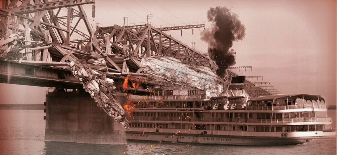 На полном ходу судно врубается в мост и стальная конструкция словно ножом, срезает верхнюю палубу. А там — кинозал ...