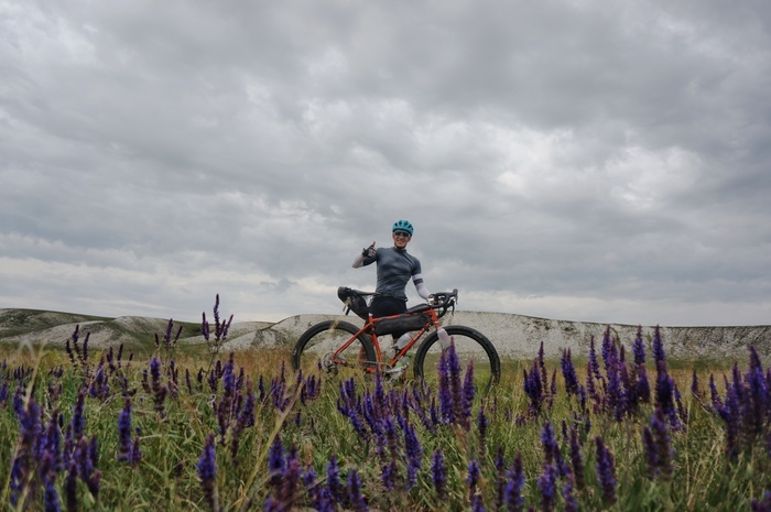 На самом деле, километраж мог выйти чуть поменьше, но слишком увлеклись и зацепили кусочек старого трека, накрутив почти 20 лишних километров. В степях сейчас красиво: всё цветёт, а ветер разносит приятные запахи ещё не выгоревших под палящим солнцем трав.