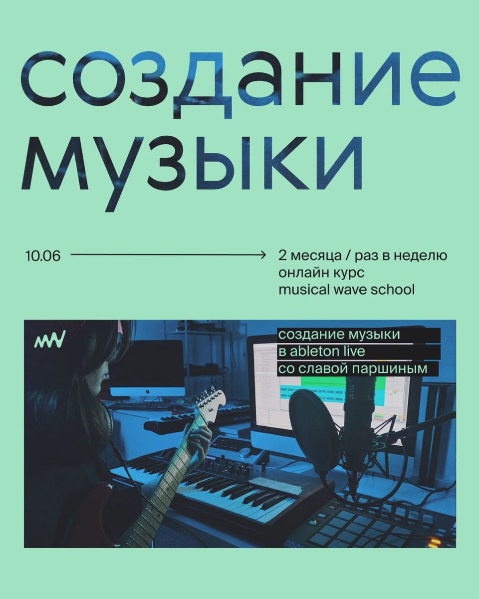 от мелодии в голове до готового трека всего за два месяца. 10 июня стартует базовый онлайн-курс о том как писать музыку в Ableton Live. если вы никогда не открывали программу, или делаете наброски по наитию (или по ютуб), то наш курс поможет легко усвоить функции Ableton и, главное, понять принципы создания трека – на курсе мы практикуем все технические аспекты и развиваем креативное мышление. будем учиться создавать свое настроение в музыке. покажем, как искать, фиксировать и развивать идею. освоив функционал программы, вы научитесь собирать трек: задумка – барабаны – бас – мелодия – запись аудио – обработка звука. ведёт: Слава Suawa Паршин – барабанщик, битмейкер, музыкальный продюсер. вырос на музыке Колтрейна и Мэдлиба. создавал музыку для Manizha, Loboda, MARKINA, брендов Adidas, Чикен Карри, Aliexpress. выпускник musical wave school. 🖍 записаться на курс формат: онлайн вебинары + материалы и задания длительность: 2 месяца расписание: вторник 20:00–21:30 старт: 10 июня летня