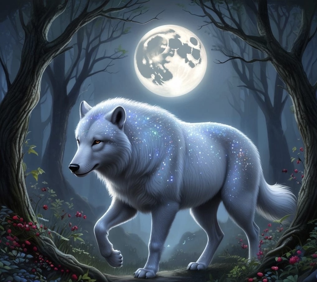 На третий день, усталые, голодные и напуганные, они вышли на небольшую поляну, залитую серебристым светом восходящей луны. И тут они Его увидели. У самого края поляны, пил воду из лесного родника. Это был не огромный страшный зверь, а грациозное существо, размером с большую лису. Его шерсть действительно переливалась мягким, холодным светом, как будто впитала в себя лучи луны. Большие, умные глаза светились спокойствием. Это был **Лунный Зверь**. Он поднял голову и посмотрел прямо на них. В его взгляде не было ни страха, ни злобы – только глубокая мудрость и тихое сияние.