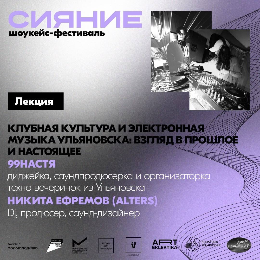 В ответ на пост СПИКЕРЫ ШОУКЕЙС—ФЕСТИВАЛЯ «СИЯНИЕ» 99НАСТЯ — диджейка, саунд-продюсерка и организаторка техно вечеринок из Ульяновска. Постоянная гостья Грузинских (Батуми) и Российских фестивалей и вечеринок (Самара, Казань, Москва, Санкт-Петербург). Выпускается, как на российских, так и зарубежных лейблах. Свой путь начала в 2020 году, будучи арт-менеджеркой Ульяновского клуба электронной музыки «Ось». Никита Ефремов (AlterS) — Dj, продюсер, саунд-дизайнер. Начал свою карьеру DJ с резиденства в клубе «Ось» (2020-2021). На данный момент занят на позиции арт-менеджера Ульяновской промо-группы “Berlin Community” и сольной карьерой. Настя и Никита прочитают лекцию "Клубная культура и электронная музыка Ульяновска: взгляд в прошлое и настоящее", на которой речь пойдет о диджеях, клубах 90-х и 00-х, промо-командах того времени, а также о формировании электронной музыки в Ульяновске. 🗓️ 26 июня, 16.00 📍Дом молодых, Радищева 154к1 🏷 вход свободный Регистрация