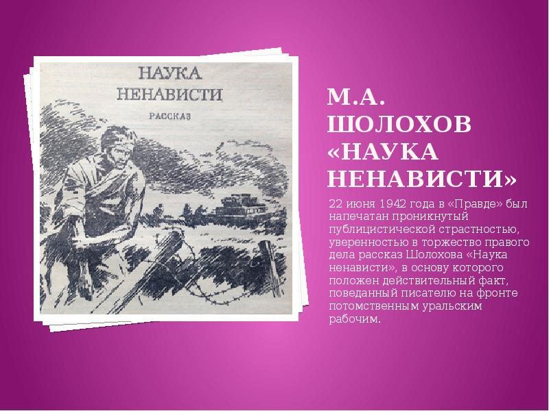 «Наука ненависти» — это пронзительное произведение Михаила Шолохова, созданное в 1942 году, в разгар Великой Отечественной войны. В этом рассказе автор раскрывает глубокие переживания и мысли человека, оказавшегося в плену у врага, и показывает, как ненависть к захватчикам формирует характер и мировоззрение советского человека. Рассказ повествует о судьбе советского офицера, попавшего в плен к немцам. Главный герой, переживший ужасы плена, делится своими мыслями и чувствами, которые помогают ему не только выжить, но и сохранить человеческое достоинство. Основные темы произведения: Рассказ «Наука ненависти» состоит из нескольких частей, каждая из которых раскрывает внутренний мир героя и его взаимоотношения с врагом. «Наука ненависти» — это произведение о стойкости и мужестве советского человека, о его способности противостоять врагу даже в самых тяжёлых условиях. Шолохов показывает, как ненависть к захватчикам помогает сохранить силу духа и веру в победу. Автор поднимает вопросы о зна