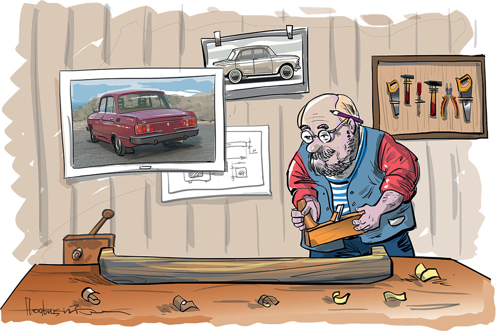 Как-то ближе к концу восьмидесятых поехали в деревню. Батя, сдавая задним ходом, об угол бани раскрошил половину заднего бампера. Крики, вопли, мама папу костерит, бабушка причитает, отец аж похудел от переживаний. Главное — где бампер новый в Сибири на «Москвич» купить? На дворе перестройка вовсю идет: перебои с продуктами и бензином начались — какие тут запчасти? Помог отцу дедушка. У нашего Игната Васильевича, папиного отца, руки откуда надо росли. Приехал он к нам, штангенциркулем и рулеткой замерил параметры живого куска бампера и уехал обратно в деревню. Через пару недель попросил родителей привезти шпатлевки по дереву и серой краски в тон бампера. Купили, привезли. Вечером дедушка отцу говорит: «Ну, сын, вот тебе от меня подарок». Смотрим — в сарае на верстаке бампер лежит. Как настоящий, лаком и краской пахнет, и сверху серебром вставочка есть! Оказалось, что дед выточил его из… дерева! С пяти метров не отличить было от заводского, настолько искусно он был сработан. Дед и закрепил его к машине лично. Бампер состоял из трех частей: центральной секции и двух «клыков», заходящих на задние крылья — они входили в пазы основного. По размерам только немного ошибся: «клыки» отставали от кузова на пару сантиметров, а так как родной бампер. С ним и продали позднее этот «суперлюкс».