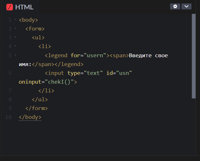 ТЗ - Создать HTML-страницу и форму для ввода имени. Запретить вводить в форму числа. <body> <form> <ul> <li> <legend for="usern"><span>Введите свое имя:</span></legend> <input type="text" id="usn" oninput="chekI()"> </li> </ul> </form> </body> ul li{ list-style-type:none; } function chekI(){ let input = document.getElementById("usn").value; for(i=0; i<input.length; i++){ if(/[0-9]/.test(input[i])){ input = input.replace(input[i], ""); document.getElementById("usn").value = input; } } } Ознакомиться с работай данного кода можно ТУТ.