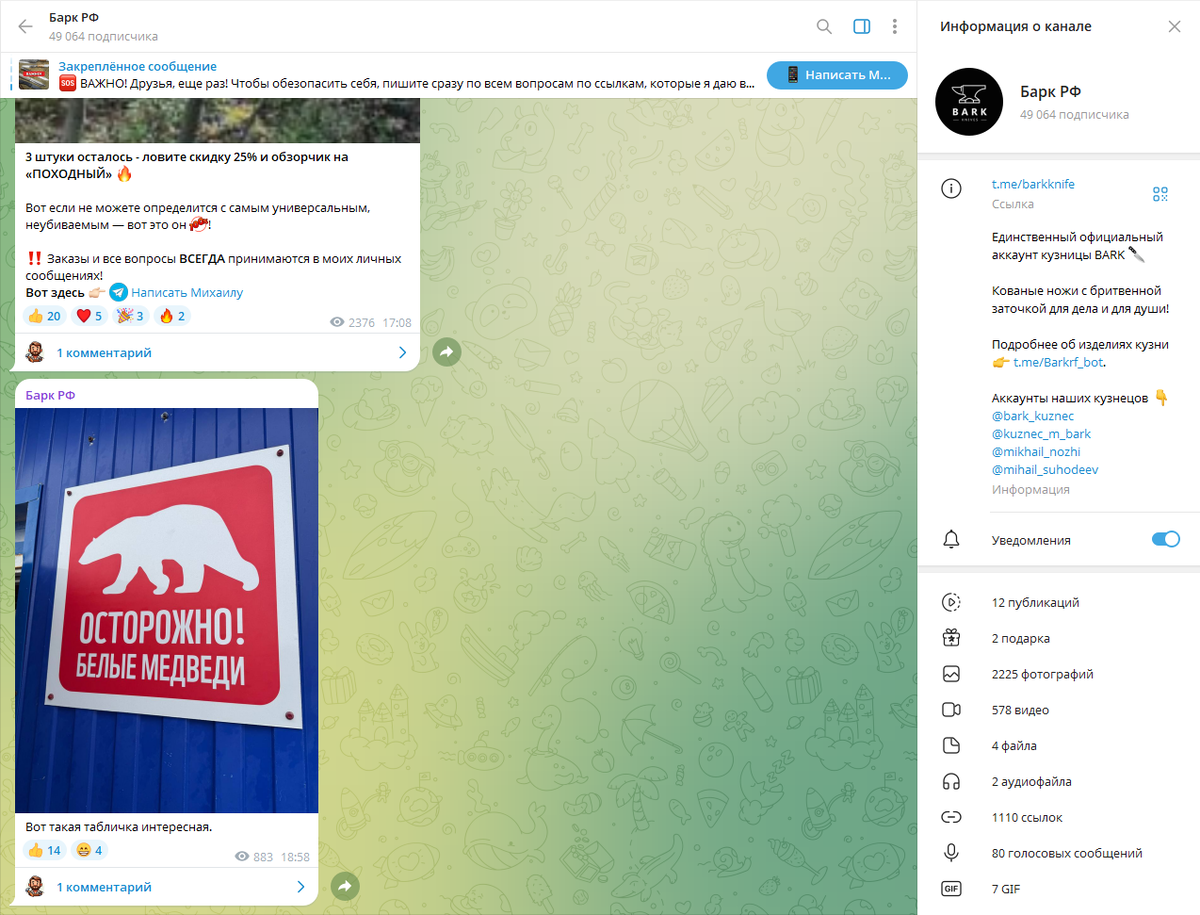 Михаил Суходеев - это якобы успешный кузнец, продающий ножи ручной работы в своих сообществах в Телеграмм и ВК. Согласно отзывам о ножах Михаила Суходеева, предприниматель завышает цены и предоставляет не всегда качественную продукцию. Более подробно о ремесленнике давайте поговорим в данное статье. Проведя небольшой аудит собранных о Барк РФ отзывах, в том числе и поддельных, мы пришли к следующим выводам: Таким образом, основной проблемой является возможная ложь, связанная с легендой о товаре. Было замечено, что негативные отзывы на странице кузнеца часто удаляются. Но опять же повторимся - ножи ручной работы от кузни Михаила Суходеева доходят до покупателя в 100% случаев. Однако завышенная стоимость и сомнительное происхождение клинков вызывает ряд вопросов. Поискав информацию о кузнице Барк в сети, можно встретить ряд официальных сайтов-лендингов с каталогом продукции. Если вы действительно хотите себе финку НКВД, мечтайте о ней и желаете ее всей душой - тратьте свои кровные и раду