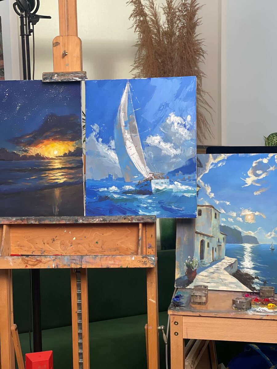 На курсе «Живописный акрил» я в первую очередь постарался раскрыть его живописность приручив его главное качество : быстрое высыхание. Три абсолютно разные по технике работы показывают разнообразность материала и его возможности. Акрил прекрасно ведет себя как в работе кистями так и мастихином. Я доволен результатом!