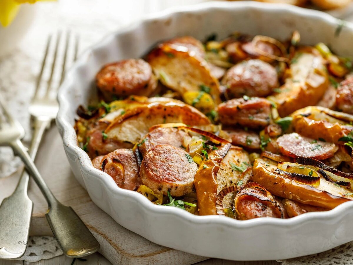 Эта ароматная колбасная запеканка идеально подойдет для семейного ужина, особенно когда хочется сытного блюда, которое согревает и радует вкусом. Она проста в приготовлении и требует всего несколько простых шагов. Запеканка получается нежной внутри и хрустящей сверху благодаря сочетанию картофеля, овощей и сыра. Шаг 1: Подготовка ингредиентов Шаг 2: Обжаривание лука и колбасы Шаг 3: Формирование запеканки Шаг 4: Выпечка Шаг 5: Завершающий этап — сырная корочка Это идеальное решение для тех, кто любит готовить простое, но невероятно вкусное блюдо. Оно сочетает в себе сочность мяса, сладость помидоров и приятный хруст картофеля с ароматом специй. Готовое блюдо украсит любой семейный ужин или праздник. Приятного аппетита!