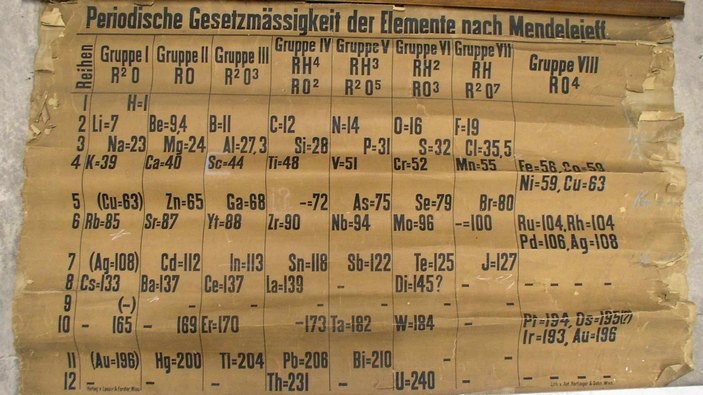На этой фотографии, судя по всему, самая старая из сохранившихся настенных таблиц Менделеева, которые были изданы типографским способом