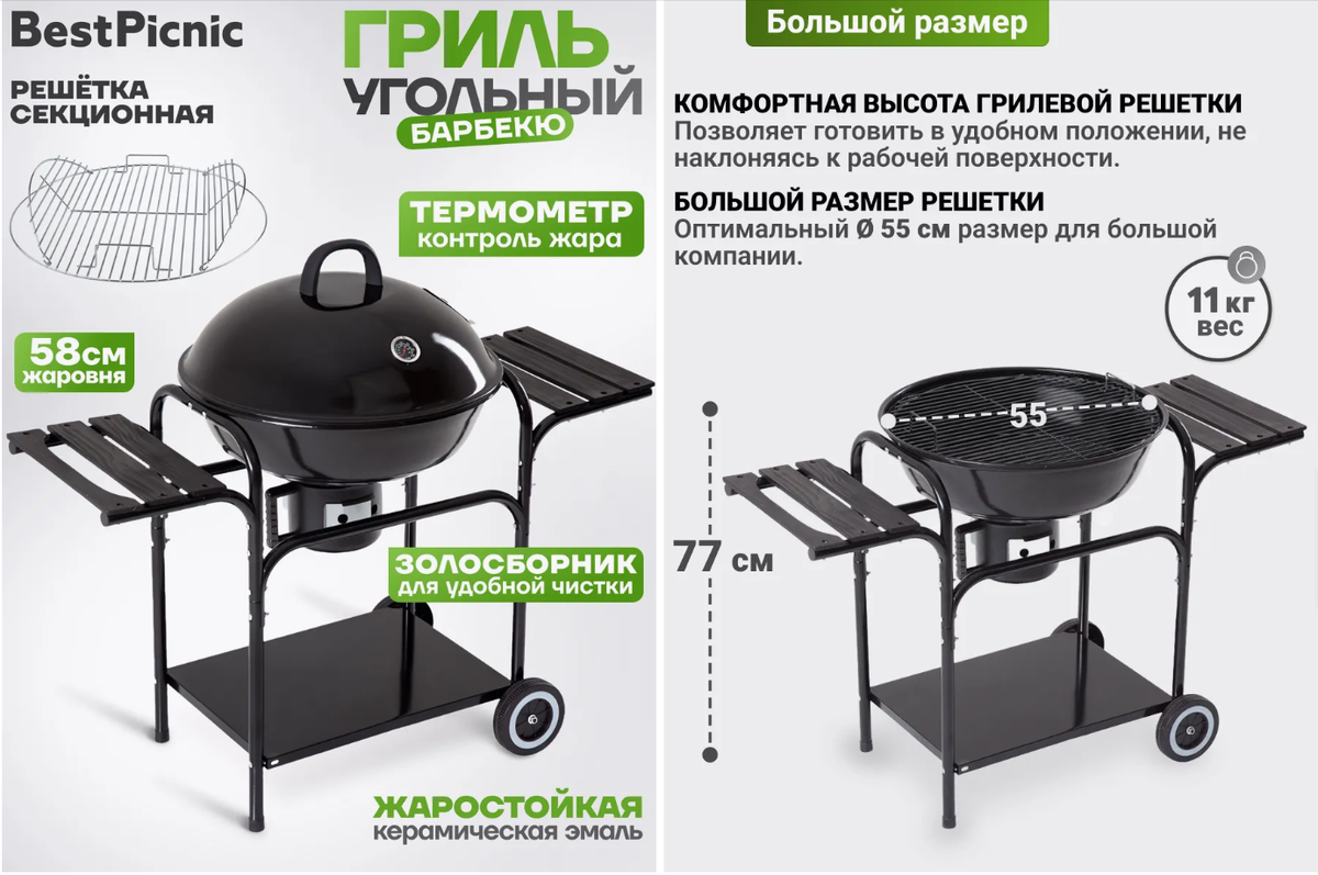 Позвольте представить идеальный гриль для настоящих гурманов и любителей пикника. Уникальные вентиляционные отверстия и встроенный термометр дарят блюда с идеальной степенью прожарки. Практичный съемный золосборник упрощает уборку, а три вместительных полки облегчают приготовление пищи. Надежная конструкция и жаропрочная эмаль надолго сохранят внешний вид гриля. Время почувствовать себя шеф-поваром на собственной кухне под открытым небом!