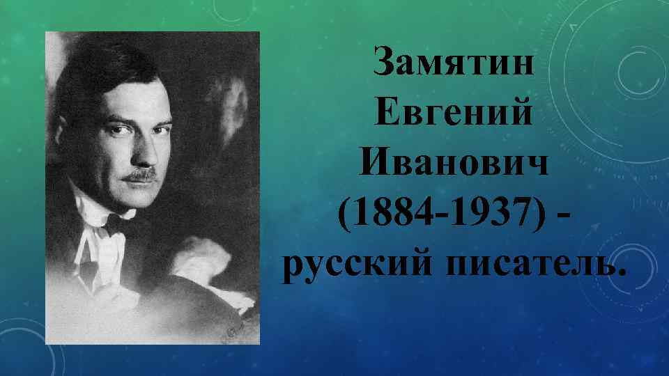 Евгений Замятин родился 20 января (1 февраля) 1884 года в небольшом городке Лебедянь Тамбовской губернии. Его отец, Иван Дмитриевич, был православным священником и школьным учителем, а мать, Мария Александровна, — талантливой пианисткой. Замятин вспоминал: «Я рос под роялем — мать была хорошей музыканткой. Читал Гоголя, когда мне было четыре года. Детство моё прошло большей частью без друзей; книгами были мои друзья». Эта изоляция и погружение в литературу с ранних лет сформировали его богатое воображение и склонность к самоанализу.