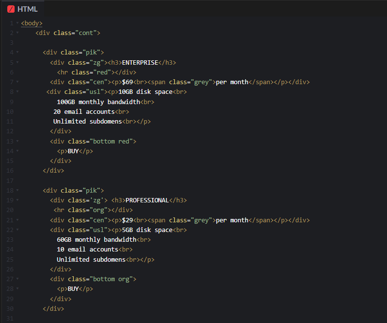 ТЗ - Создайте HTML-страницу и расположите на ней несколько карточек покупок. <body> <div class="cont"> <div class="pik"> <div class="zg"><h3>ENTERPRISE</h3> <hr class="red"></div> <div class="cen"><p>$69<br><span class="grey">per month</span></p></div> <div class="usl"><p>10GB disk space<br> 100GB monthly bandwidth<br> 20 email accounts<br> Unlimited subdomens<br></p> </div> <div class="bottom red"> <p>BUY</p> </div> </div> <div class="pik"> <div class='zg'> <h3>PROFESSIONAL</h3> <hr class="org"></div> <div class="cen"><p>$29<br><span class="grey">per month</span></p></div> <div class="usl"><p>5GB disk space<br> 60GB monthly bandwidth<br> 10 email accounts<br> Unlimited subdomens<br></p> </div> <div class="bottom org"> <p>BUY</p> </div> </div> <div class="pik"> <div class='zg'><h3>STANDARD</h3> <hr class="blue"></div> <div class="cen"><p>$19<br><span class="grey">per month</span></p></div> <div class="usl"><p>3GB disk space<br> 30GB monthly bandwidth<br> 5 email accounts<br> Unlimited